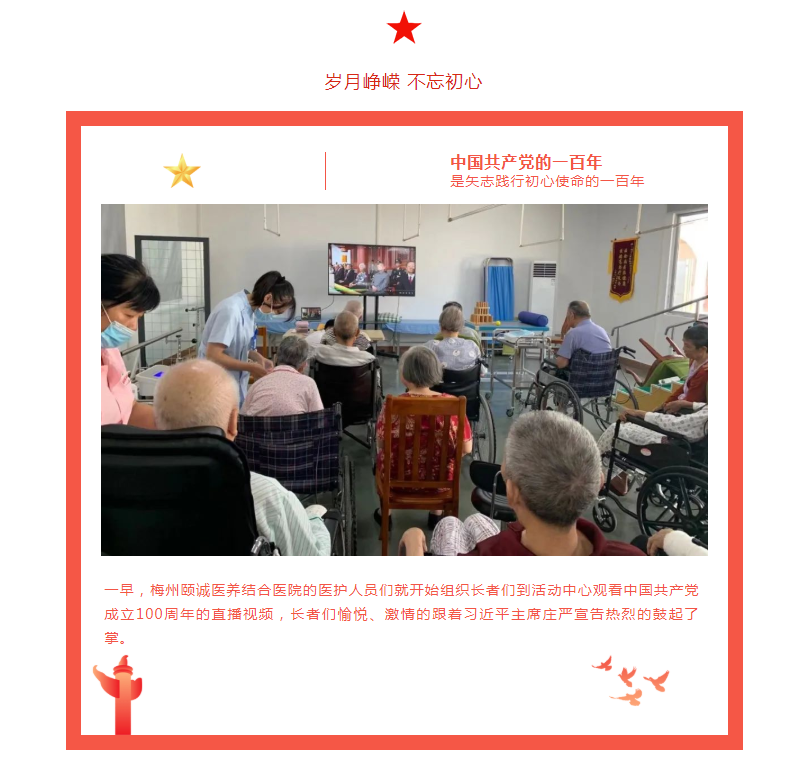 中國共產黨成立100周年的同時也是梅州頤誠醫養結合醫院正式進駐梅州市福利院的日子。在今后的發展中,我們將不忘初心,砥礪前行,秉承著“優于服務,勇于擔當,善于創新”的宗旨,提供專業醫療、養老、護理服務團隊,打造特色個性化服務,為長者們晚年生活提供保障