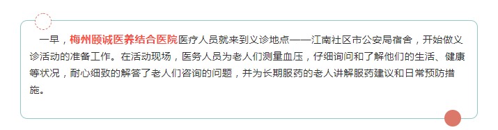 為了更好地滿足社區居民的需求,傳播文明理念、引領文明風尚,提高居民的健康意識,倡導健康生活方式,普及健康生活理念,4月27日,梅州頤誠醫養結合醫院攜手江南社區居委,聯合鼎和社工、愛明眼科、澤山口腔、義剪志愿者服務隊開展“文明健康-有你有我”健康服務進小區活動